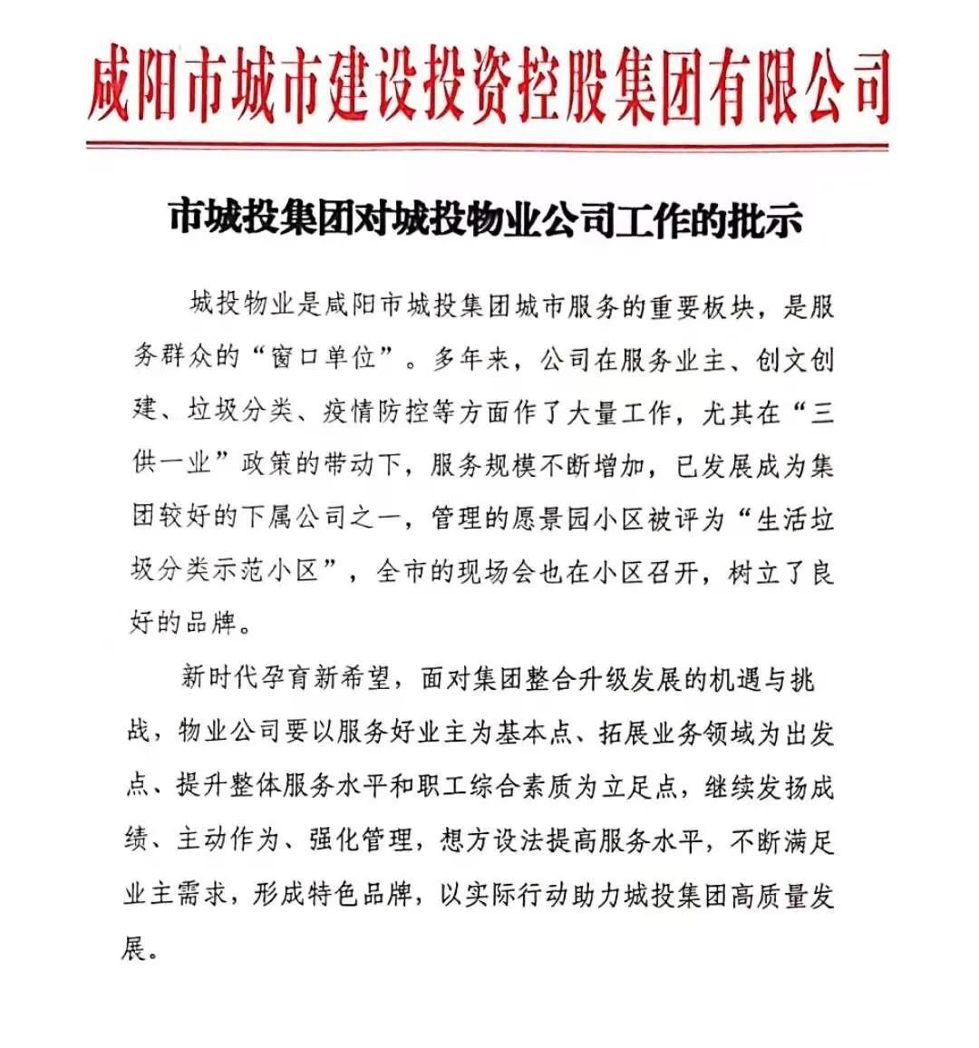 會議開始前,王雅玲宣讀《市城投集團對城投物業(yè)公司工作的批示》。批示中指出,多年來,城投物業(yè)在服務業(yè)主、創(chuàng)文創(chuàng)建、垃圾分類、疫情防控等方面作了大量的工作,尤其在“三供一業(yè)”政策的帶動下,服務規(guī)模不斷增加,已成為集團較好的下屬公司之一,樹立了良好的品牌。希望城投物業(yè)在今后的工作中,繼續(xù)發(fā)揚成績、主動作為、強化管理,想方設法提高服務水平,以實際行動助力城投集團高質(zhì)量發(fā)展。